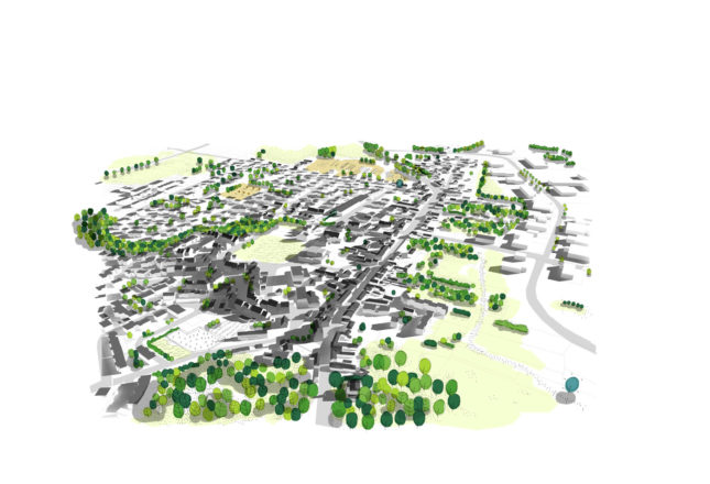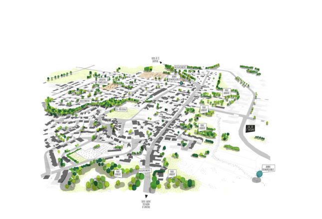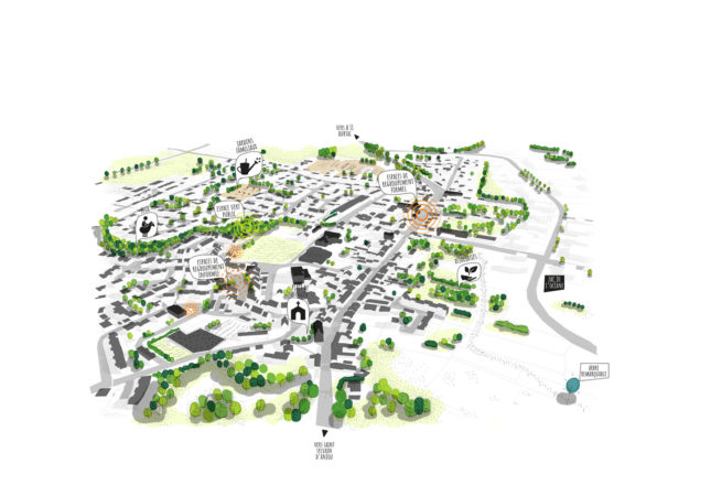 La conception urbaine d’ensemble ambitionne clairement de constituer une centralité nouvelle en coeur de ville, aux abords du carré des arts, de l’école et de la maison de la santé. Ainsi il s’agit de mettre en valeur du Carré des Arts par déconnection du système viaire, création d’une ouverture visuelle, et d’un parvis piétonnier. La coulée verte existante est renforcée jusqu’en coeur de bourg. Le projet, aux formes urbaines denses pour libérer l’espace public, mise avant tout sur la facilité d’accessibilité piétonne, la diversité des espaces de rencontre et place l’automobile en second rang avec des stationnements proches et intégrés dans des bulles de végétation.