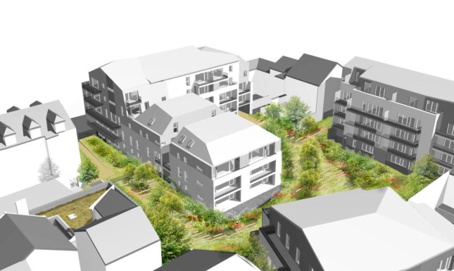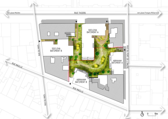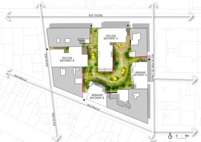 Aux abors du site, la disposition du bâti créé des «fenêtres» proposant différents cadrages sur le coeur d’îlot. Perceptibles depuis la rue,elles se propagent comme des ondes,hors les murs,attirant notre regard. En approchant, peu à peu, un îlot verdoyant s’offre à nous,véritable espace de respiration, au coeur d’un tissu urbain pourtant bien dense. La composition de ce jardin s’articule autour de subtils mouvements de sols. Ces oscillations génèrent de micros reliefs (creux et buttes) sur lesquels se dresse une végétation particulière apportant au jardin de multiples variations (couleurs, ports, textures, floraisons…) tout en répondant à des contraintes plus techniques (jardin sur dalle).