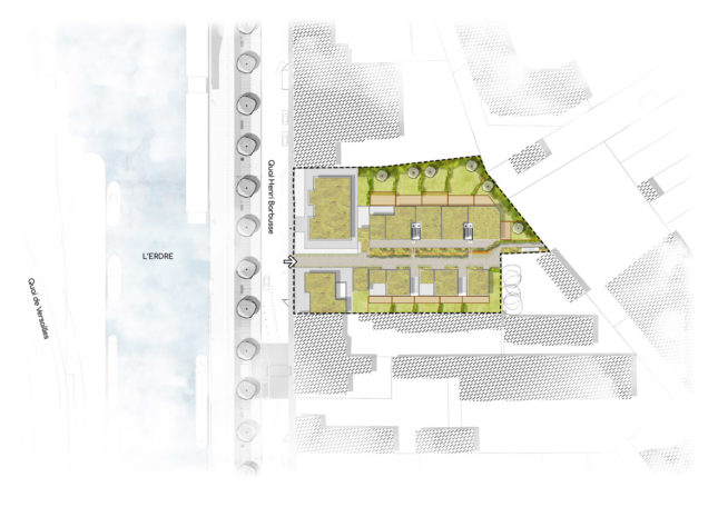 L’îlot donnera sur les quais de l’Erdre et aura égalemetn une venelle intimiste mettant en scène le fond végétal. En limite Est, on constate la présence d’éléments de patrimoine bâti et arborés de qualité. Le principe de l’aménagement proposé serait un coeur d’ilot vert prolongeant la trame verte qui soit connecté à la ville.