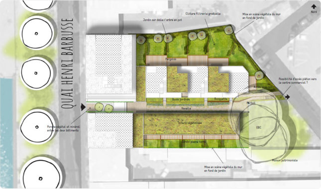 Le végétal est au coeur des préoccupations du projet, en accord avec la volonté de la ville de créer des poumons verts et de les disperssés en son sein. Pour ce faire, la proposition de projet qui a été faite, est composée :