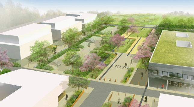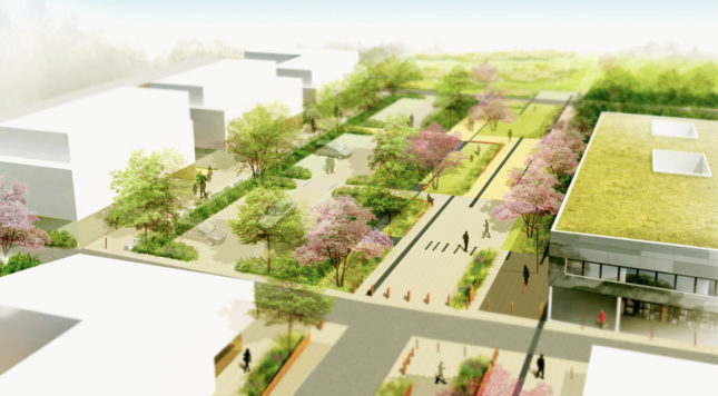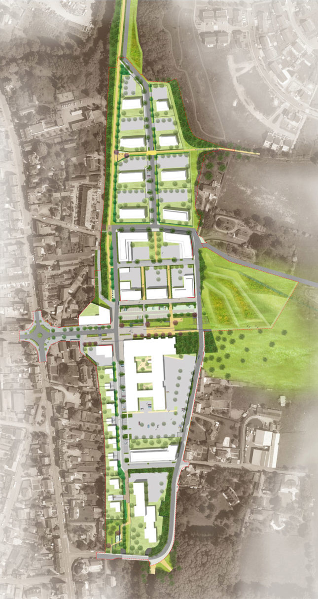 Le quartier se structure ainsi autour d’une esplanade centrale accueillant un pôle santé, des commerces et services. Un jeu de hauteurs bâties dessine une urbanisation dialoguant avec le relief marqué et la vallée évasée de l’Anthaise. Une trame végétale vient structurer cet ensemble, diffuser l’ambiance boisée du site et renouer le lien perdu entre la vallée et la ville…
