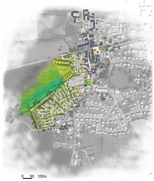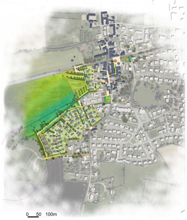 – Prolongement de la silhouette du bourg dans le paysage par de nouvelles constructions prolongent la logique d’urbanisation étagée et intégrée par un végétal filtrant.