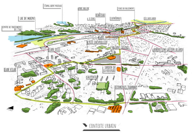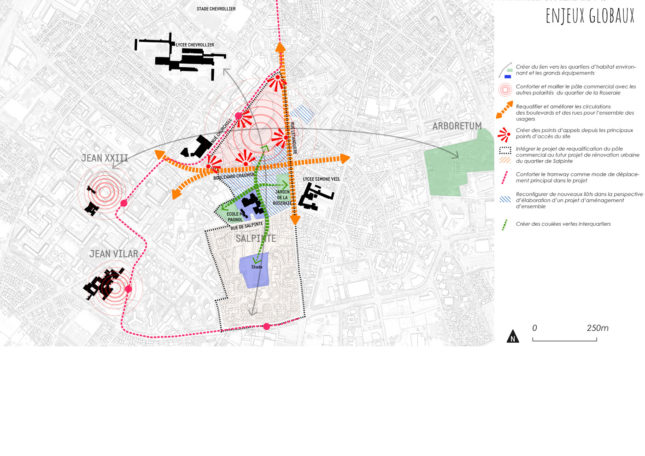 – L’affirmation des parcours urbains en modes doux orientés vers le Square et le Lycée au Nord-Est, les quartiers Est et le quartier de Salpinte au Sud.